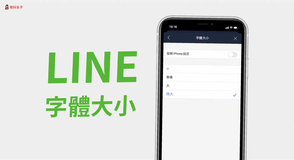 先關閉「依照 iPhone 設定」後,再按照你的喜好來調整 LINE 內的字體大小,目前有四個選項: