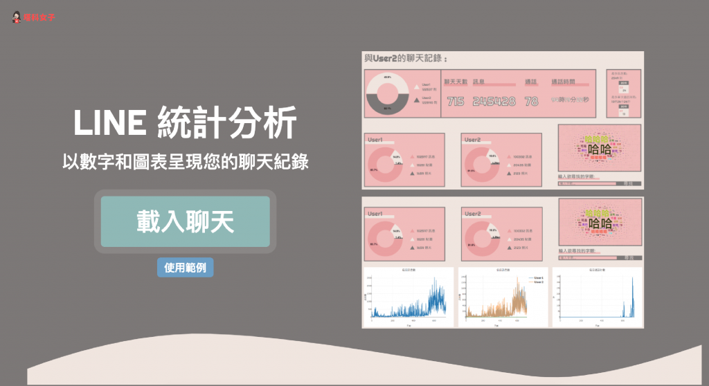 網友 chonyy 在今年初開發出一個網頁版的服務「LINE 統計分析」,只要匯入你與某個人或某個群組的聊天紀錄後,就會自動以數字和圖表呈現聊天訊息統計,包含:聊天天數、訊息總數、通話時間、常用字詞等。
