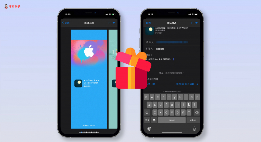 接著確認一下贈送內容、日期與對象,確認沒問題後點選「購買」,這樣就成功囉,對方會在指定日期收到這 App。