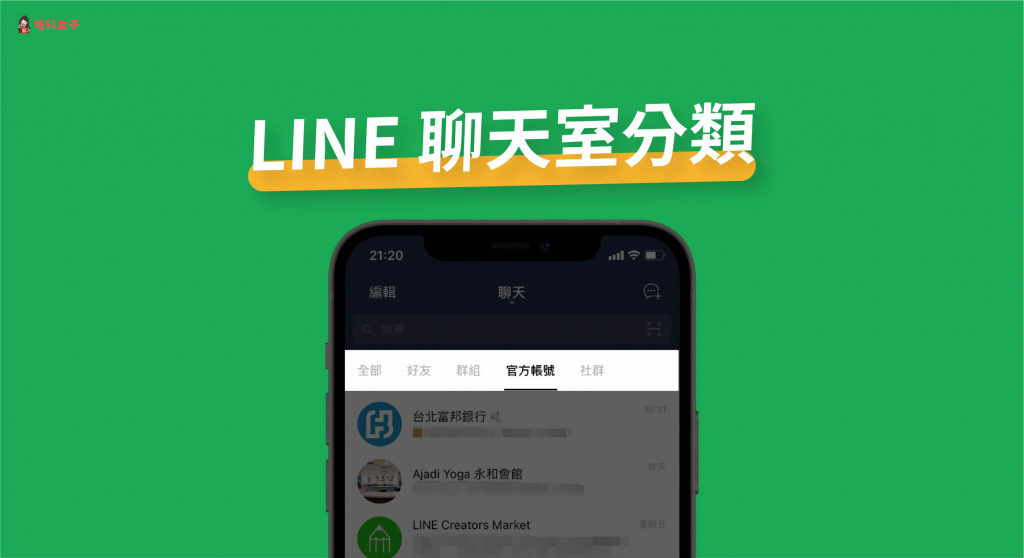 接下來回到 LINE 聊天室頁面,頂端就會出現各個不同的類別替你分類好,包含:全部、好友、群組、官方帳號及社群,這樣以後 LINE 版面就會看起來更整齊了,不會被官方帳號洗版轟炸。
