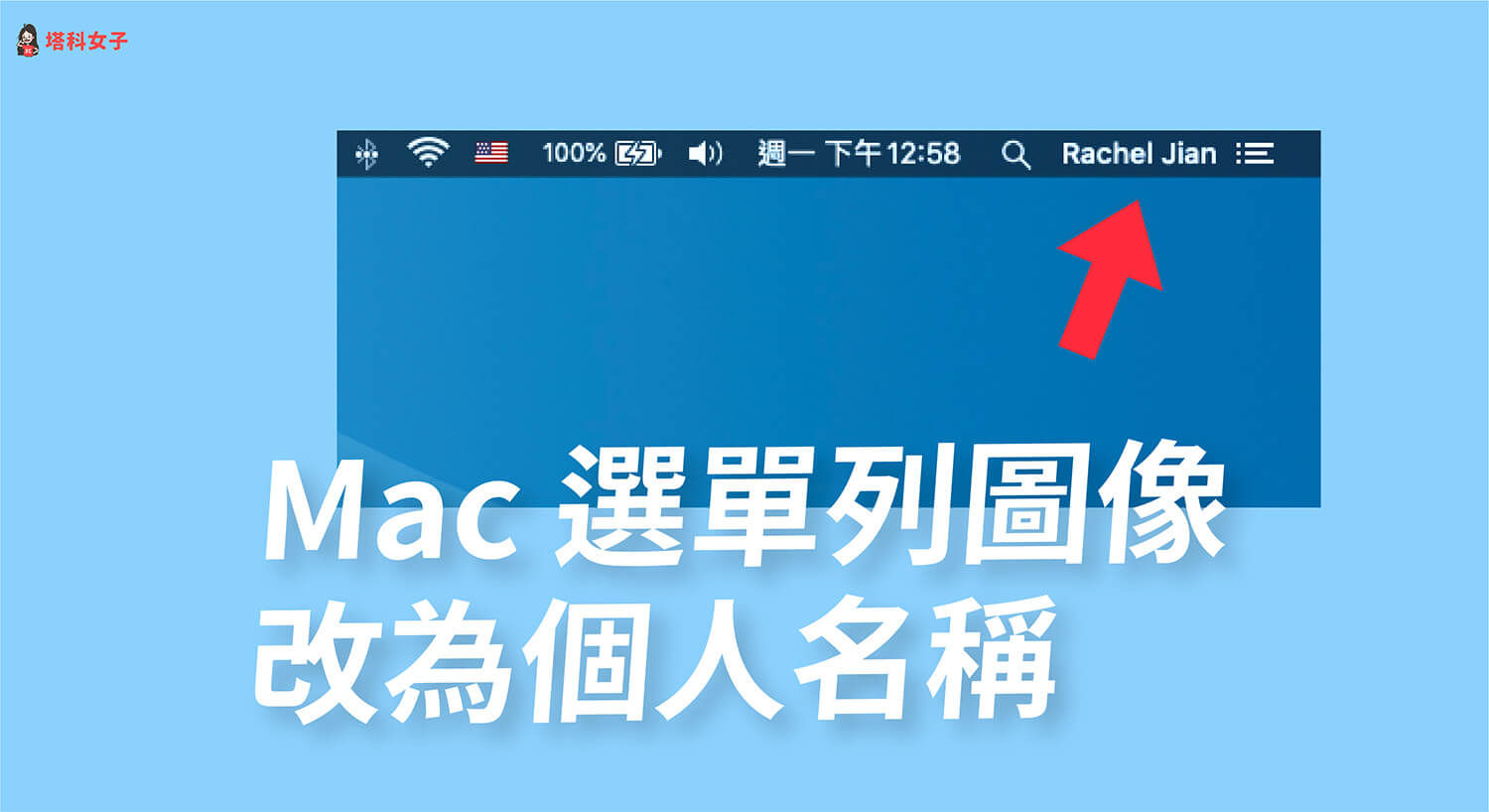 - 更改完成後,Mac 選單列上的圖像就會變成你剛剛設定的偏好選項,由於我剛剛選擇「全名」,因此它就顯示為個人名稱,這樣就更改成功囉!