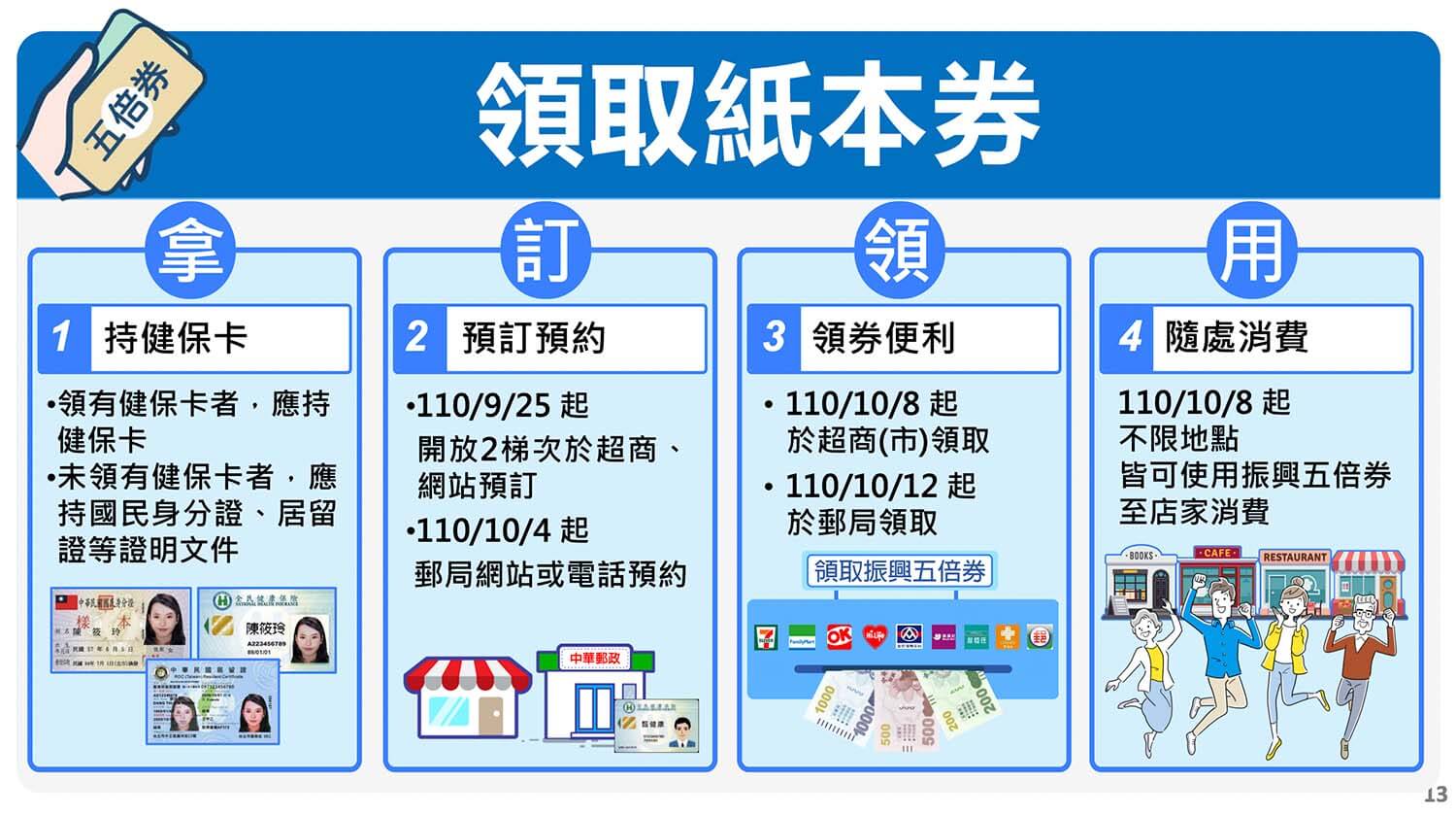 若當初是透過「郵局網站」或「郵局電話預約」紙本五倍券,那在 10/12 開始就可以到你選擇的郵局領取,記得要攜帶健保卡,沒有健保卡的話,要帶國民身分證、經外交部認定之證件或居留證等身分證明文件。