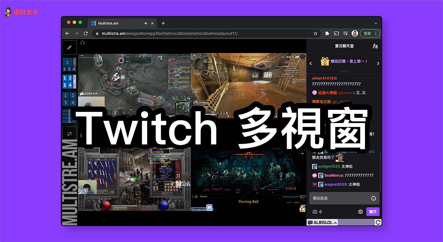 我們通常都只會一次觀看一個 Twitch 實況直播,如果想看多個不同頻道,就只能一個瀏覽器視窗開一個 Twitch 直播,但其實我們可以使用多視窗工具在同一個瀏覽器視窗上觀看多個 Twitch 實況頻道喔!