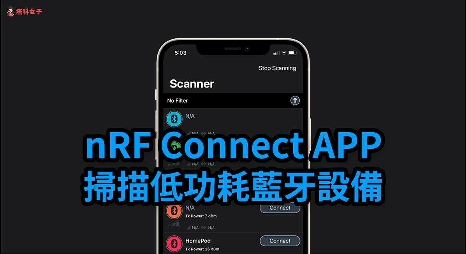 nRF Connect 是一款功能強大的低功耗藍牙掃描 APP,可以協助我們搜尋並偵測位置附近的低功耗藍牙設備,除了常見的藍芽裝置之外,也包含一些使用藍牙技術且你可能看不到的 Beacon 裝置,這些低功耗藍牙裝置不會出現在手機裡的「藍牙」內,因為它們預設會被隱藏起來,但是現在我們可以使用 nRF Connect APP 來將所有低功耗藍牙設備都找出來。