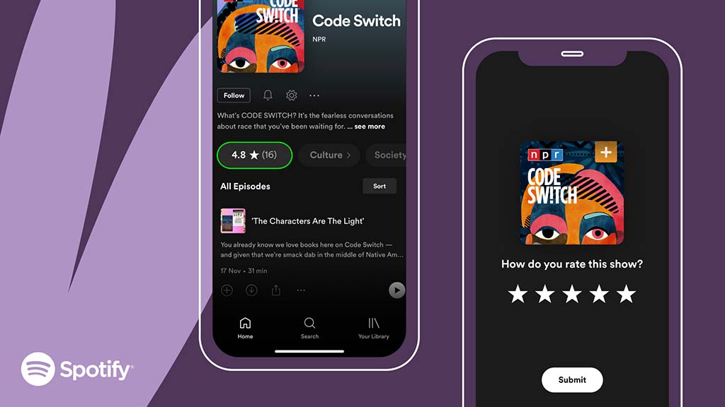 Spotify 在 12/16 宣布 Podcast 服務將新增「評分」功能,聽眾可以在聽完 Podcast 節目時於跳出的評分視窗上選擇 1 ~ 5 星評價,這功能也逐漸向全球用戶釋出。雖然 Apple Podcast 早已推出評分留言功能,但不太一樣的是,Apple Podcast 沒有限制你要聽完節目才能評分,隨時都可以評價。