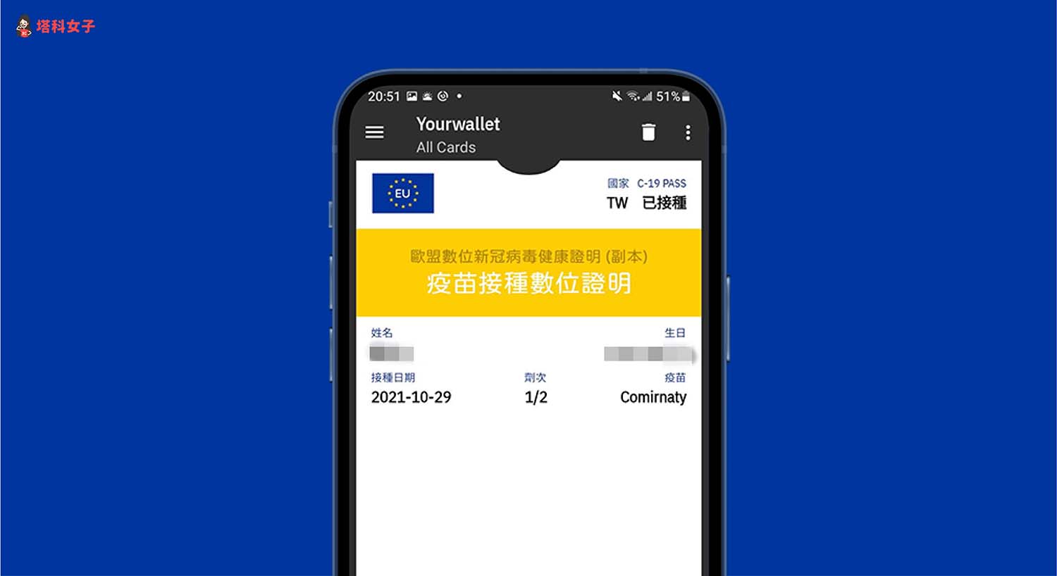 之後將 QR Code 上傳到「Digital Covid Pass」網站即可建立「歐盟數位新冠證明」,然後再加到 Yourwallet APP 裡,需要出示時直接在 Android 手機出示疫苗接種證明。