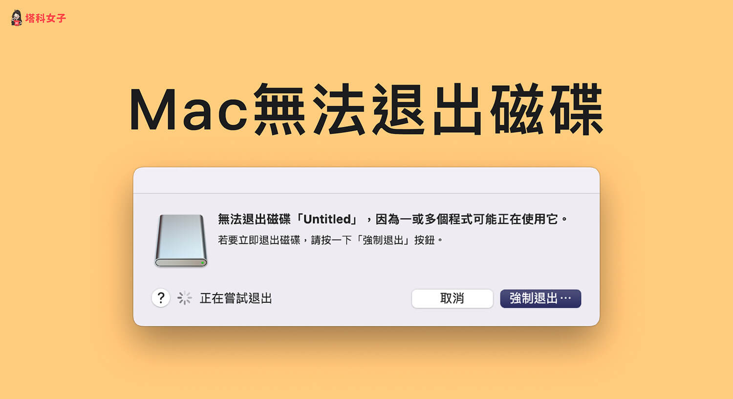 如果你在 Mac 電腦上要安全退出隨身碟或硬碟時,Mac 卻顯示「無法退出磁碟」或「無法退出硬碟」的提示,但你明明確定已經沒有在存取磁碟內的檔案了,這時建議大家盡量避免按「強制退出」也不要直接拔除外部裝置,避免資料不見或消失。
