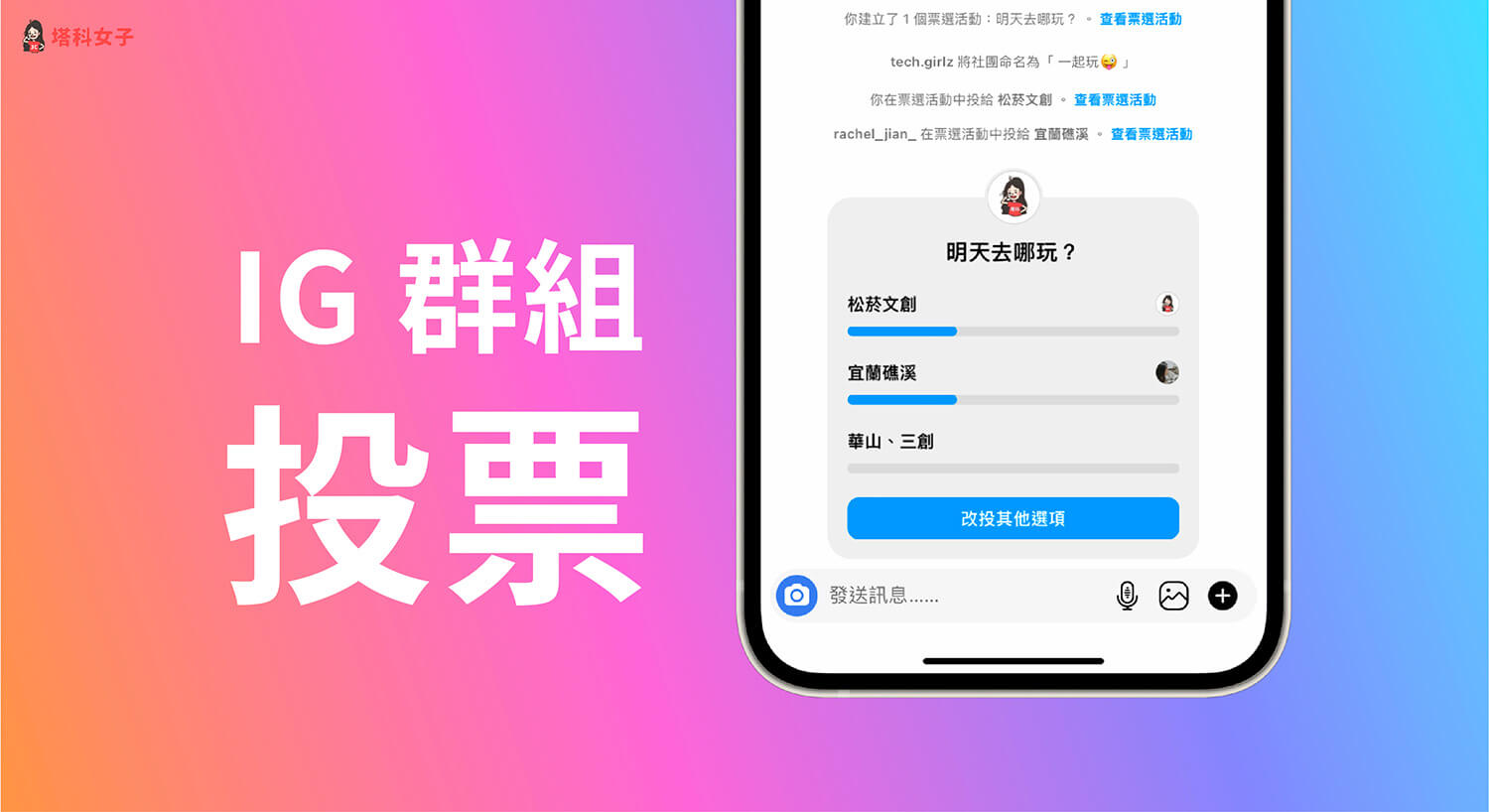 Instagram 近期為「訊息聊天室」新增了幾項新功能,其中一個很實用的功能就是「票選活動」,以前這功能只在 IG 限時動態出現,但現在我們可以在 IG 群組聊天室裡新增投票活動了。