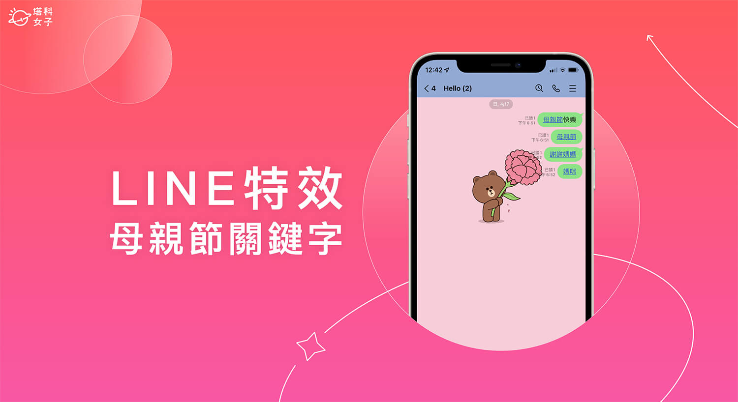 LINE 母親節特效終於來了!每年五月的第二個禮拜天是屬於媽媽的節日,在母親節這天別忘了親自跟媽媽說聲母親節快樂,但如果你想透過傳訊息的方式像媽媽祝賀,那我們只要在聊天室裡輸入 LINE 母親節關鍵字就可以觸發母親節專屬的聊天室背景特效喔!背景會變成粉紅色,且可愛的熊大會拿著一束康乃馨獻花。