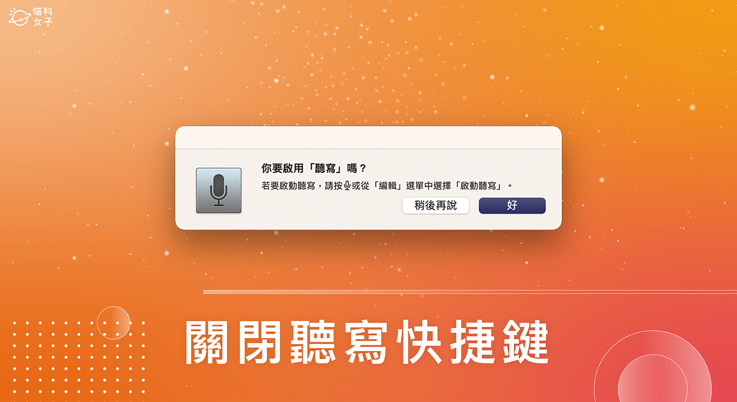 家裡的貓咪很愛踩在 Mac 電腦的鍵盤上,每次當牠亂踩到指定快捷鍵(麥克風鍵 F5)時,Mac 畫面上就會跳出「你要啟用聽寫嗎?」的視窗,雖然只要按一下「稍後再說」就可以關閉,但我還是希望能直接將 Mac 聽寫快捷鍵關閉,這樣就不會再跳出視窗。