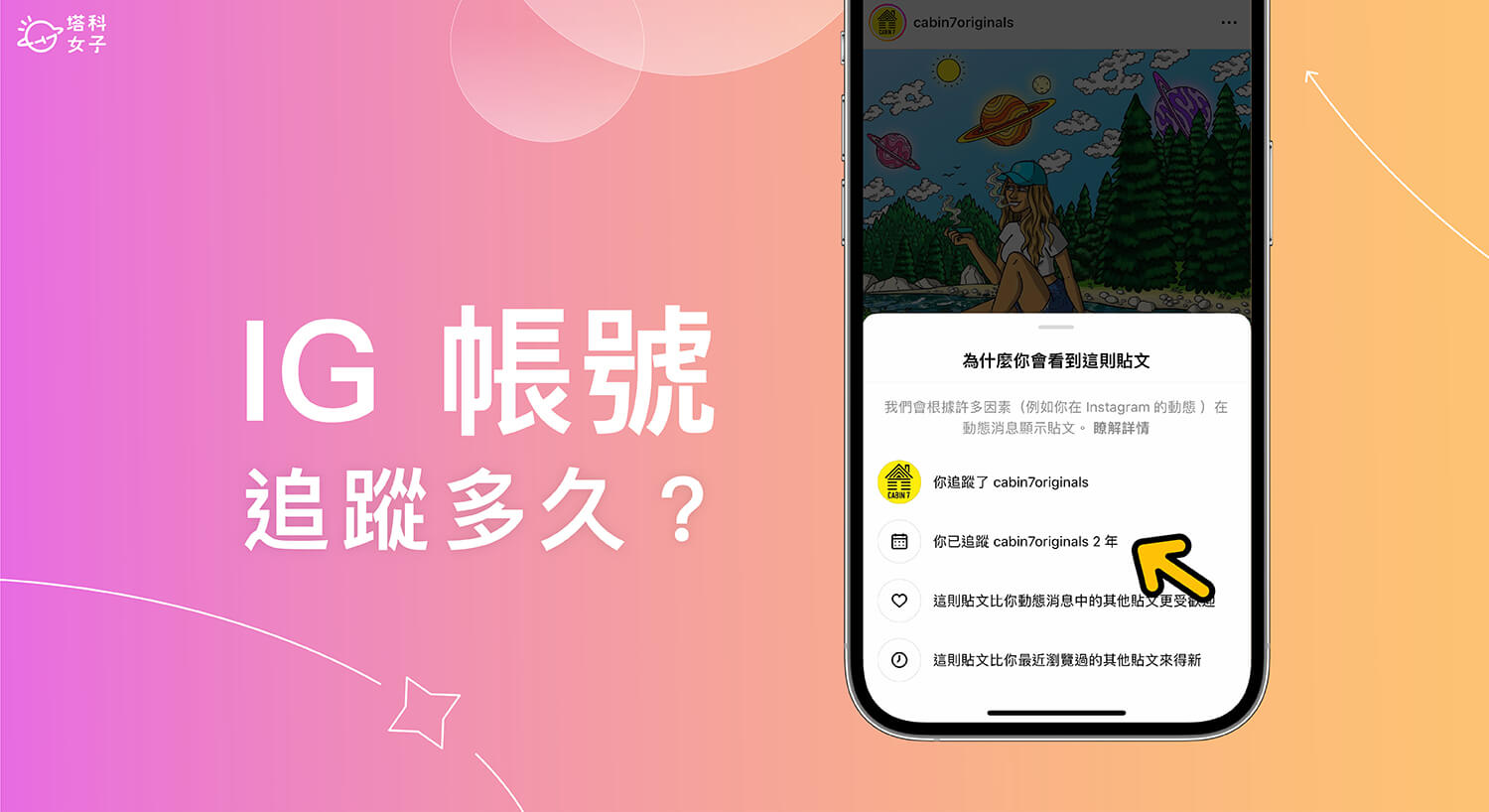 - 在「為什麼你會看到這則貼文」下方的內容裡,系統會顯示「你已追蹤 [某IG帳號] 幾年或幾個月」的時間,這樣我們就能查詢出自己對某一帳號的 IG 追蹤時間有多久了。