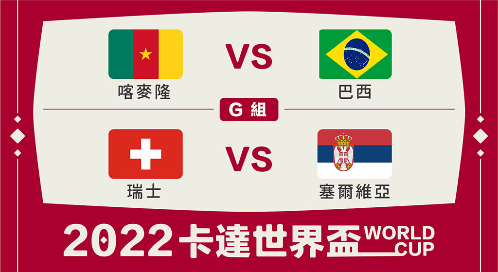 如果你也想觀看 12/3 凌晨的 2022 世界盃 G 組小組賽喀麥隆對巴西賽事、瑞士對塞爾維亞賽事,都可參考本文整理的資訊,會列出即時的世足轉播直播線上看、運彩賠率、戰績分析預測。