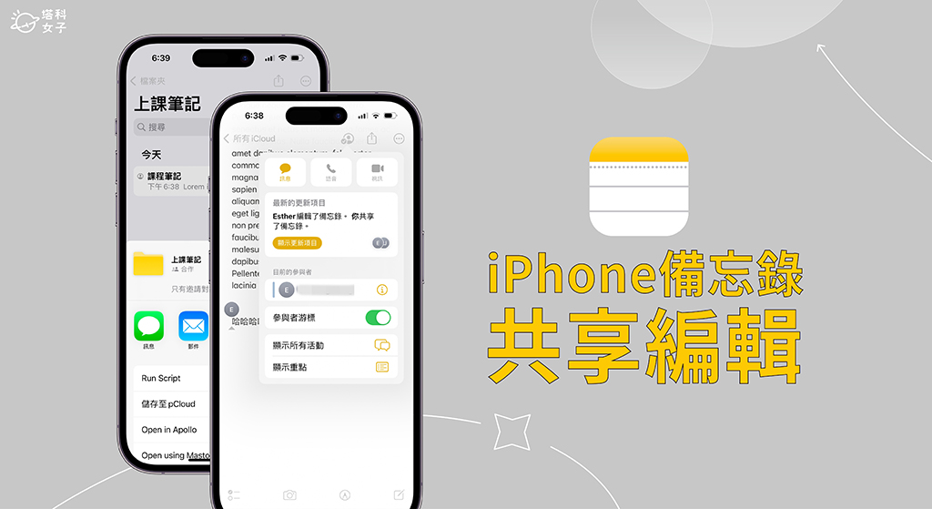 如果你也想和家人朋友或同學、同事一起編輯同一份筆記,那別忘了可以使用 Apple 內建的 iPhone 備忘錄共享功能,iOS 16 新增的「合作」讓我們可以快速透過 iPhone 共享備忘錄給其他用戶,也能自由決定共享權限與對象,非常實用!
