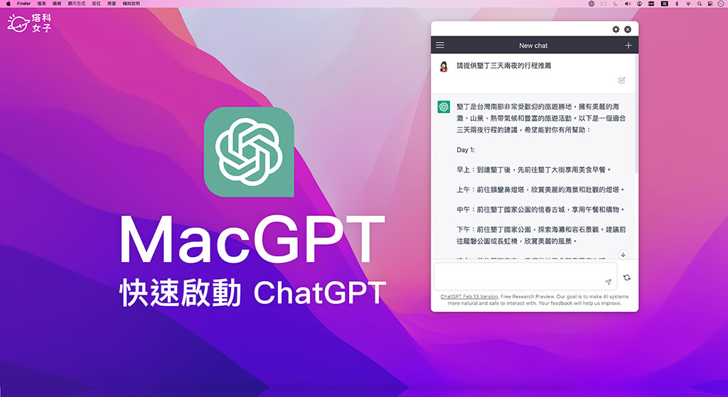除此之外,你也可以開啟 MacGPT App,這樣它就會以應用程式的方式打開 ChatGPT,讓你可以自由移動視窗,不限於只能在 Mac 選單列上取用。
