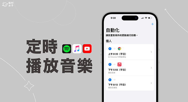 無論你希望能在 iPhone 定時播放 Apple Music、Spotify 或 YouTube,都可以參考本篇教學,透過 iOS 捷徑自動化操作進行設定。