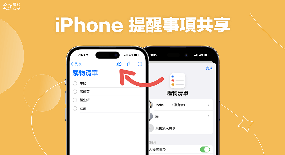 - 等對方接收邀請後,你們就能一起共享編輯 iPhone 提醒事項,成員們編輯或新增的內容都會自動同步!