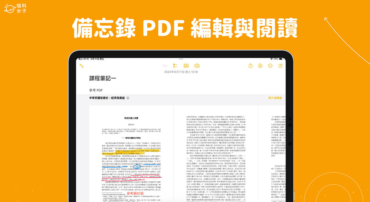 將 iPhone 更新到 iOS17,或將 iPad 更新到 iPadOS17 後,蘋果為「備忘錄」加入了實用的查看和編輯 PDF 功能,我們只要先把 PDF 文件上傳或匯入到備忘錄裡,接著就能直接在「備忘錄」中以全螢幕寬度閱讀 PDF 文件,也能使用手指或 Apple Pencil 觸控筆在 PDF 上標註文字或塗鴉、畫重點。