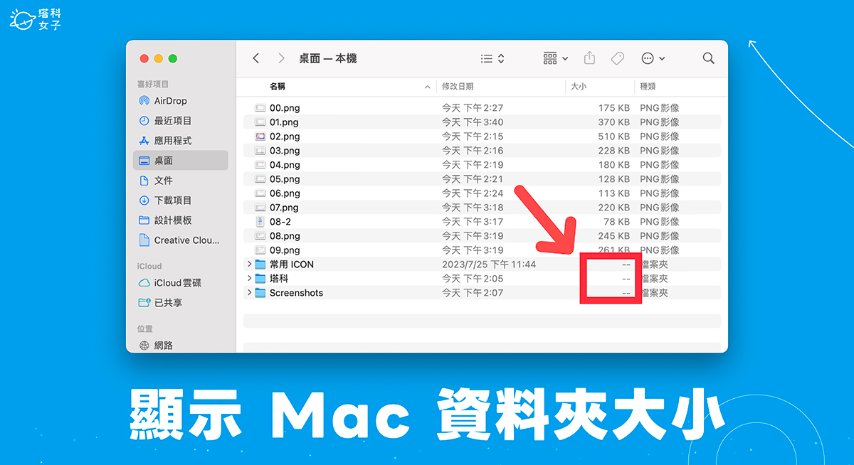 - 現在你會發現 Mac 資料夾大小只顯示「—」,而其他單一文件檔案則會顯示確切的容量。