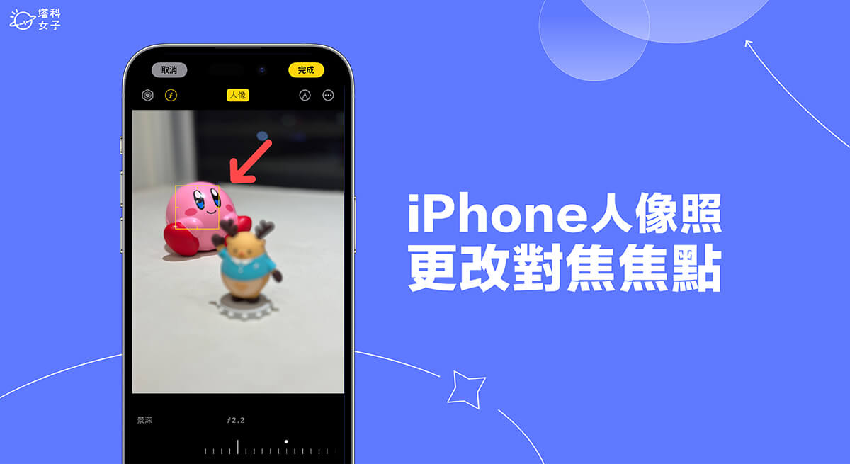 - 首先你會看到黃色方框對焦在原本的主體上,請直接在照片上點一下你想更改對焦的新主體,例如下圖,我這張人像照原本是對焦在麋鹿公仔上,現在我想對焦在後面的卡比公仔上,那我就點一下後方的卡比,這樣就成功更改 iPhone 人像照片焦點了。