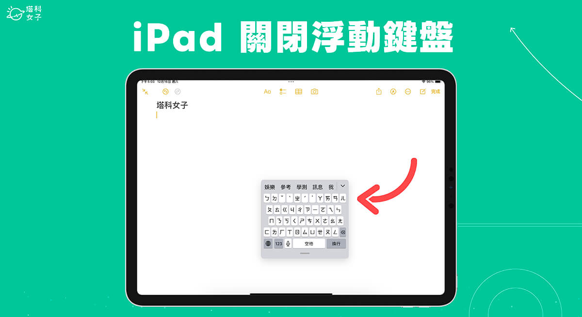 當我們在 iPad 打字時,預設的 iPad 鍵盤是延伸到全螢幕的大尺寸鍵盤,但大尺寸的缺點是會遮蓋 APP 的一半視窗,這時候我們只要在鍵盤上用「兩指往內縮合」即可啟動 iPad 浮動鍵盤,也就是較小尺寸的鍵盤,浮動鍵盤還可以自由拖拉移動鍵盤位置。