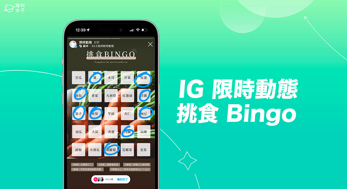 IG 挑食 Bingo 是一款由 IG 網友透過「輪到你了」範本所作的清單,上面一共有 25 種常見的挑食食物,像是芋頭、秋葵、胡蘿蔔、甜椒等等,我們只要點一下朋友該則 IG 限時動態上的「輪到你了」貼圖即可新增到自己的 IG 限動,然後就像玩賓果一樣,用畫筆在上面將你挑食的食物圈起來,看看自己連了幾條線。