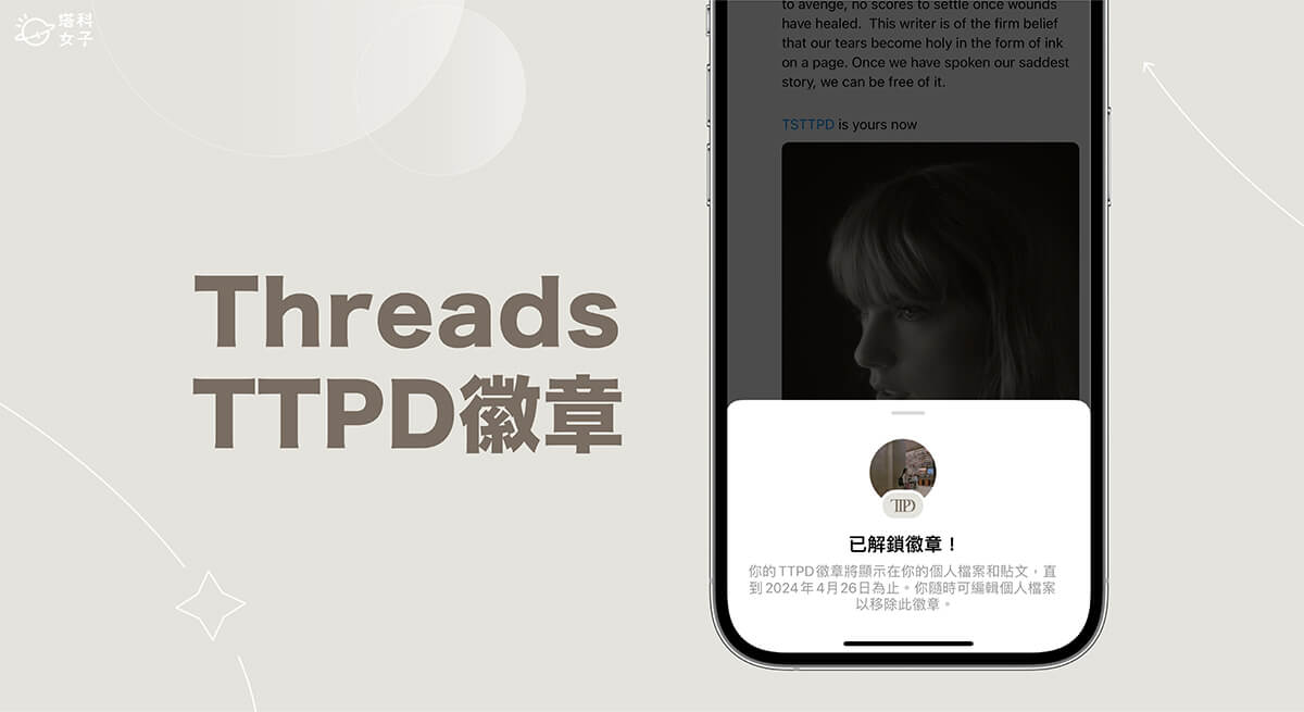 TTPD 徽章是 Threads 獨家為 Taylor Swift 粉絲推出的新功能,用戶只要轉發 Taylor Swift 的 Threads 貼文給三位好友,就能自動解鎖 TTPD 徽章,該徽章除了會顯示在 Threads 個人檔案主頁外,別人看到你發佈的貼文時也會在你的大頭貼看到 TTPD 徽章,此徽章只會顯示到 4/26,而在這之前,你隨時都可以在個人檔案設定中關閉顯示 TTPD 徽章。