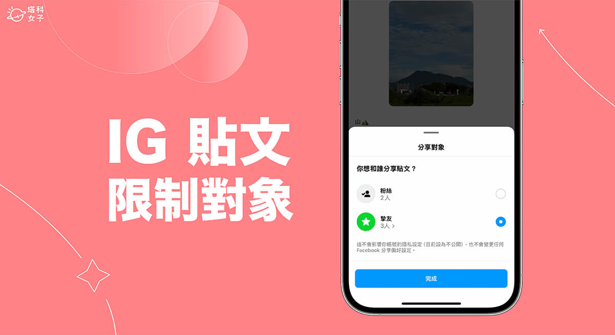 如果你只希望讓特定對象看到你發佈的某一篇 Instagram 貼文,那我們在發佈貼文時可以設定「分享對象」,目前可選擇「粉絲」或是「摯友」,且無論是公開帳號或私人帳號都可以設定。但要注意的是,IG 貼文一旦發佈出去後,就無法再更改分享對象的設定了,原本是 IG 摯友貼文的話就無法改成讓所有人觀看,而原本是讓所有人觀看的貼文也無法改成僅限摯友,所以在限制 IG 貼文分享對象前大家必須先好好想清楚。
