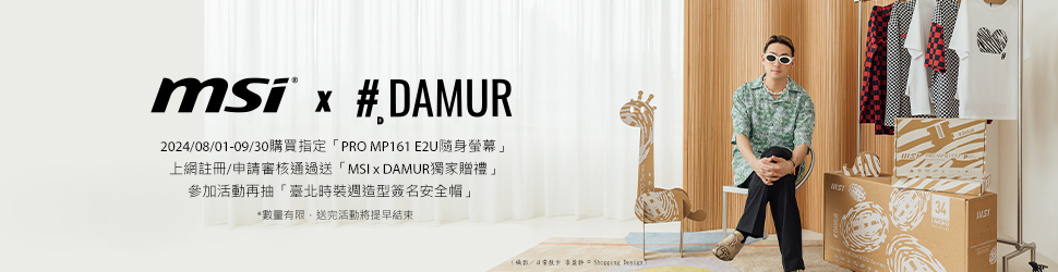 8/01-9/30 凡於微星全省授權經銷通路購買 NT$4,990 PRO MP161 E2U 隨身螢幕,上網註冊/申請即可獲得限量價值 NT$3,580「 MSI x DAMUR潮流紀念T-Shirt + 潮流貼紙 」,穿上 #DAMUR,探索無限可能。讓每一天都充滿自由、冒險與想像力。登錄參加活動再抽「 臺北時裝周造型簽名安全帽 」。