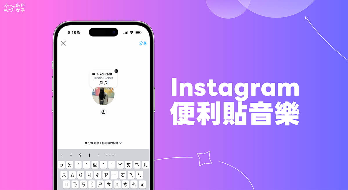 - 設定好 IG 音樂後,你一樣可以輸入文字或 emoji 表情符號,也可以在「分享對象」中選擇你的便利貼要給誰看到,然後點一下「分享」。