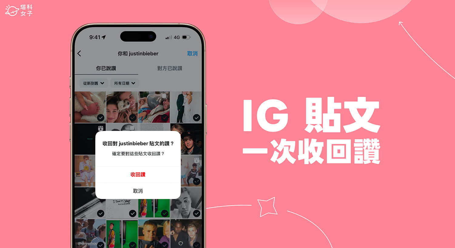現在請勾選所有你想收回讚的 IG 貼文,如果想全部收回,那就是把所有貼文都依序勾選起來,點選底下的「收回讚」,並在跳出來的小視窗中點選「收回讚」以確認,這樣就成功一次在 IG 收回所有讚了,不用再像之前那樣要慢慢找貼文再手動慢慢收回!