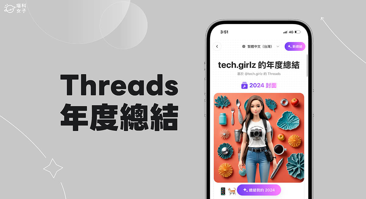 接著,AI 就會根據你今年 2024 發佈的 Threads 貼文做出年度總結,首先 AI 會幫你做一張 2024 封面,上面都是跟你今年的發生的事情有關,下方還會以爲字做出總結,並試著描述你的生活,