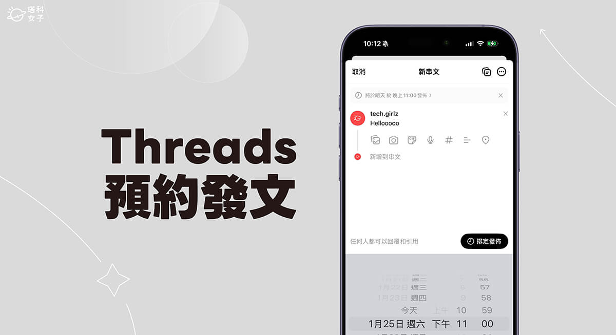 最後,在底部設定你希望 Threads 預約發文的時間與日期。設定完成後點選「排定發佈」即可完成。Threads 系統將會在你設定的指定時間自動發文!