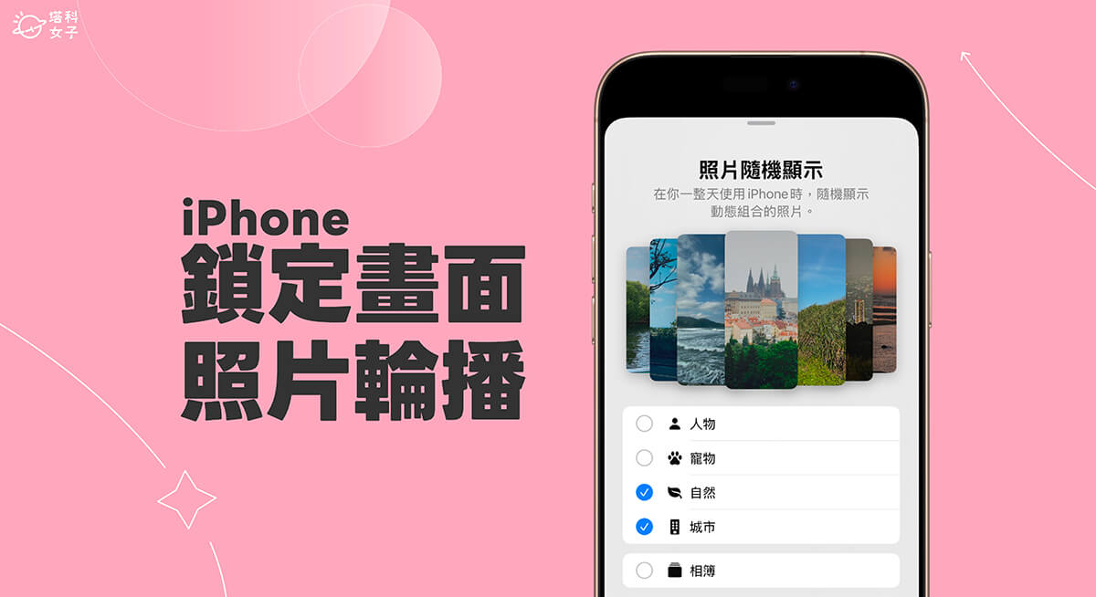 - 系統會從你的 iPhone 照片裡精選出人物、寵物、自然和城市四種組合類別,可單選或多選,甚至也可以選擇「相簿」,然後設定從指定相簿裡輪播照片。