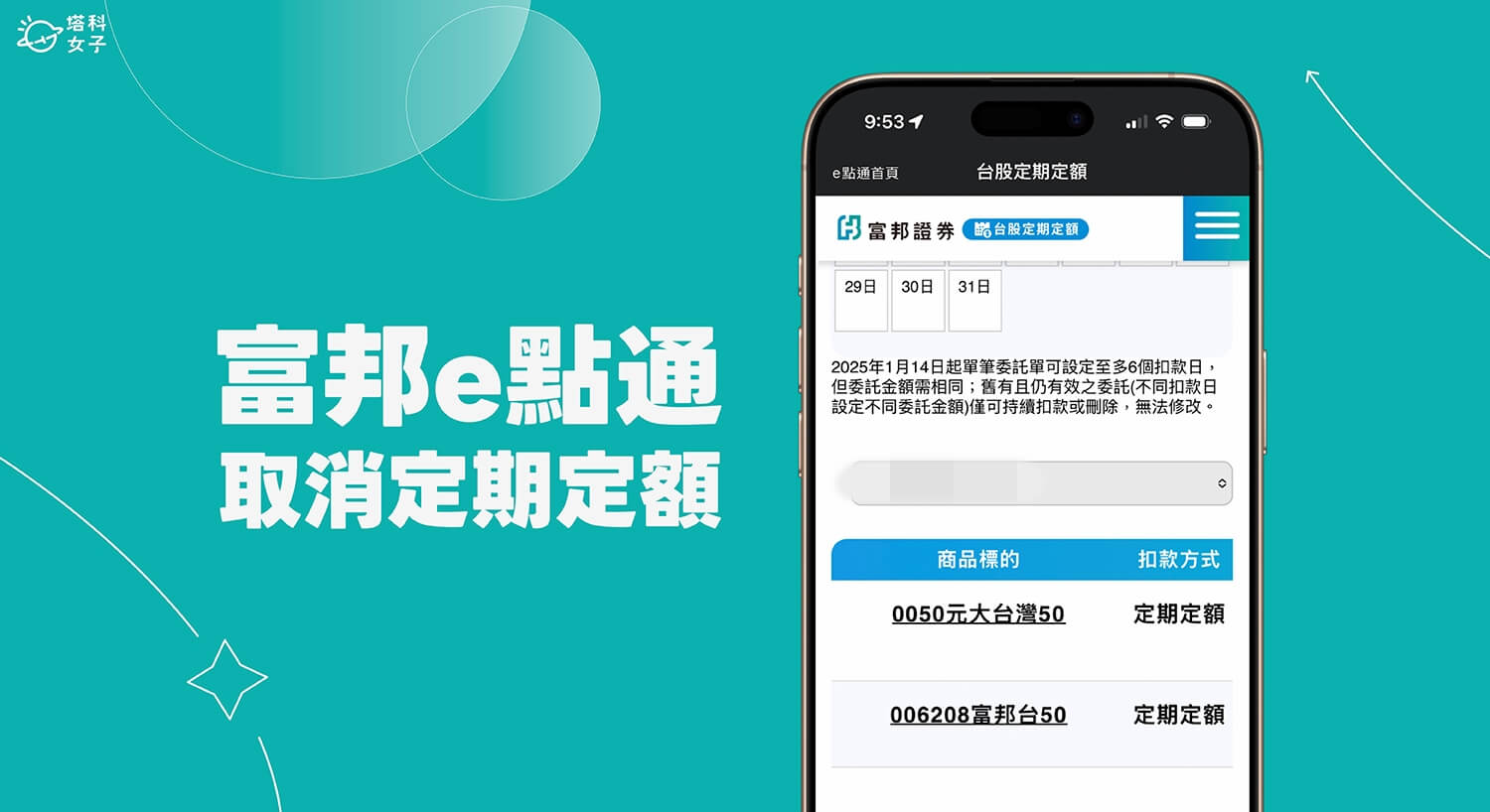 之前我們有寫過一篇文章教大家如何直接在「富邦e點通」app 設定定期定額買股票與 ETF,但有些民眾基於一些個人原因,例如想改變標的、想增加或減少定期定額金額等,因此希望能先將富邦定期定額取消。那無論你是因為什麼原因想取消,都可以繼續參考本篇的富邦e點通定期定額取消教學,會詳細教你怎麼在富邦e點通 app 取消定期定額,避免持續扣款。