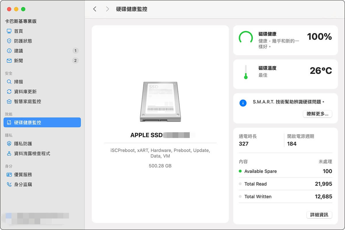 在效能方面,卡巴斯基電腦版應用程式有提供「硬碟健康監控」功能,能幫助用戶監控內外部硬碟的效能和溫度,如果有偵測到問題,它也會立即通知我們,避免自己沒有注意到硬碟的潛在問題。