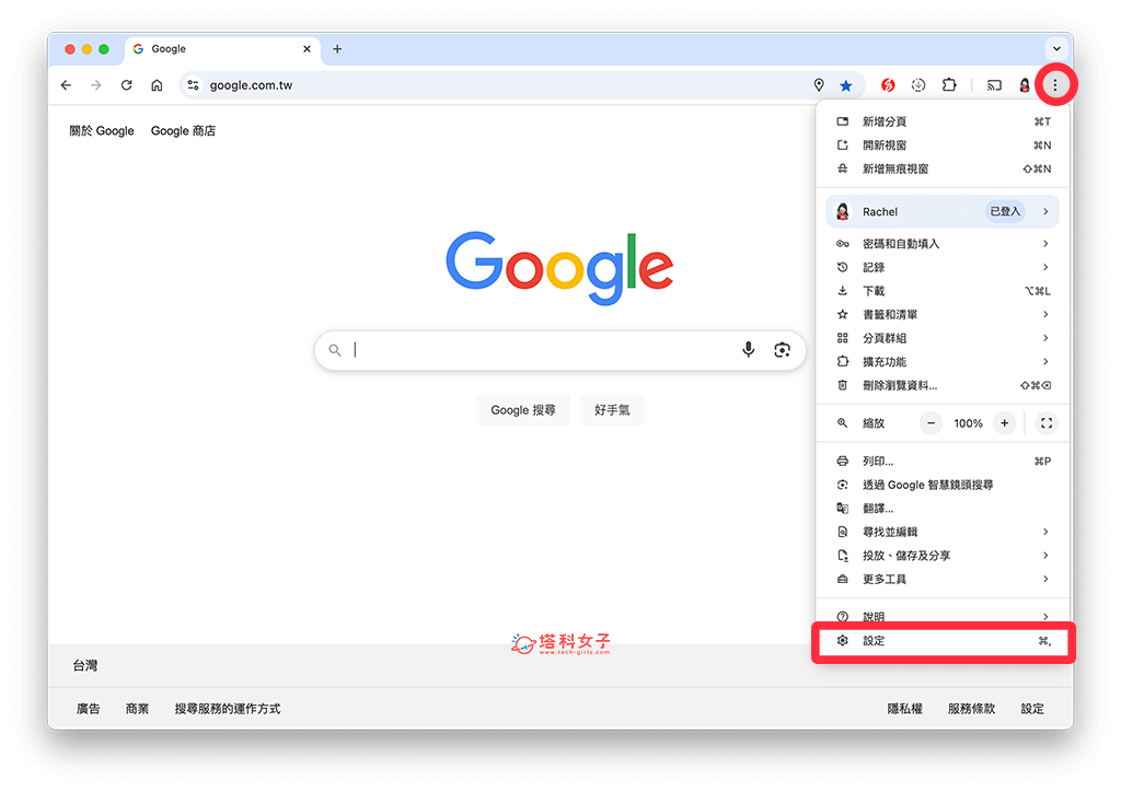 首先請開啟你 Windows 或 Mac 電腦上的 Google Chrome 瀏覽器,然後點擊右上角「⋯」按鈕,點選「設定」。