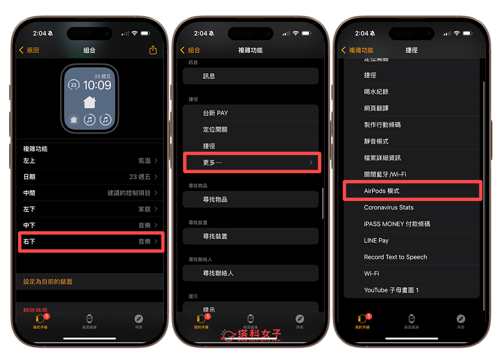 除此之外,如果你覺得每次都要點進「捷徑」才能切換 AirPods 降噪模式有點太麻煩的話,其實我們也可以直接把這個捷徑放在 Apple Watch 錶面上喔!請先在 iPhone 打開 Watch App,點進你要的錶面(該錶面必須支援「複雜功能」設定),然後在錶面的「複雜功能」點進你要放捷徑的位置,並找到「捷徑」分類後,點選「更多」,設定成剛加入的「AirPods 模式」這個捷徑。