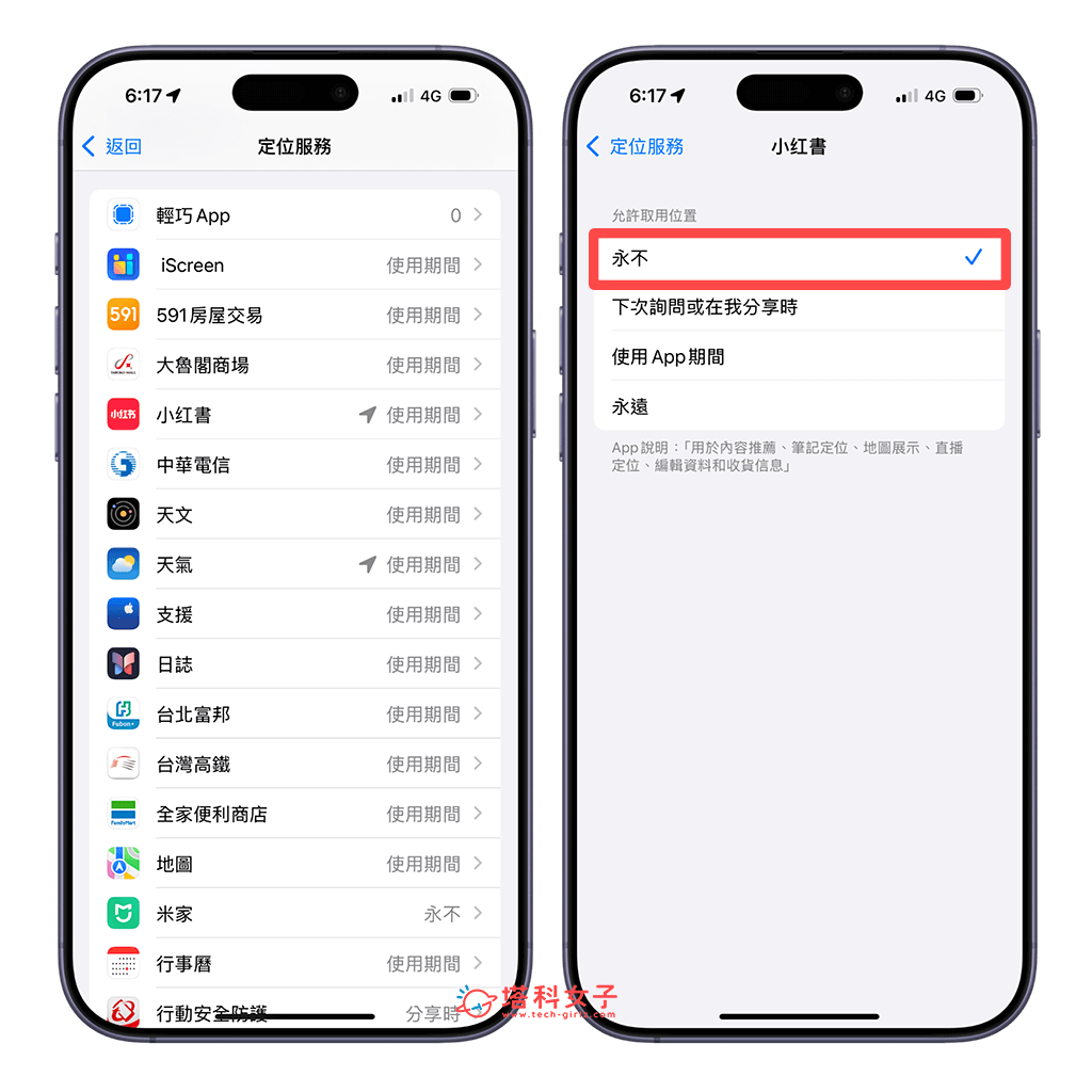 第二個 iPhone 隱私權設定就是關閉 App 定位取用權限,其實許多 App 都會取用 iPhone 定位,但如果你想好好保護自己的位置隱私,不想讓某些 App 知道你的詳細位置,那建議大家可以檢查一下App 定位權限,一樣開啟「設定 app」>「隱私權與安全性」,然後點選「定位服務」,這邊你就可以看到有哪些 App 可以取用你的定位,點進去後也可以改成「永不」讓它無法繼續取用。