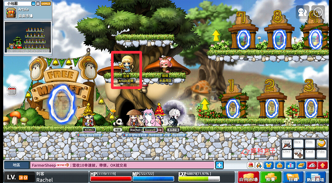 如果你缺楓幣,想賣雪花來獲得楓幣的話,那除了可以多留意廣播看看有沒有人在收雪花之外,也可以直接把雪花上架到「拍賣」裡面去販售!首先請進入到自由市場,點擊「玉順」這個 Artale 拍賣 NPC。
