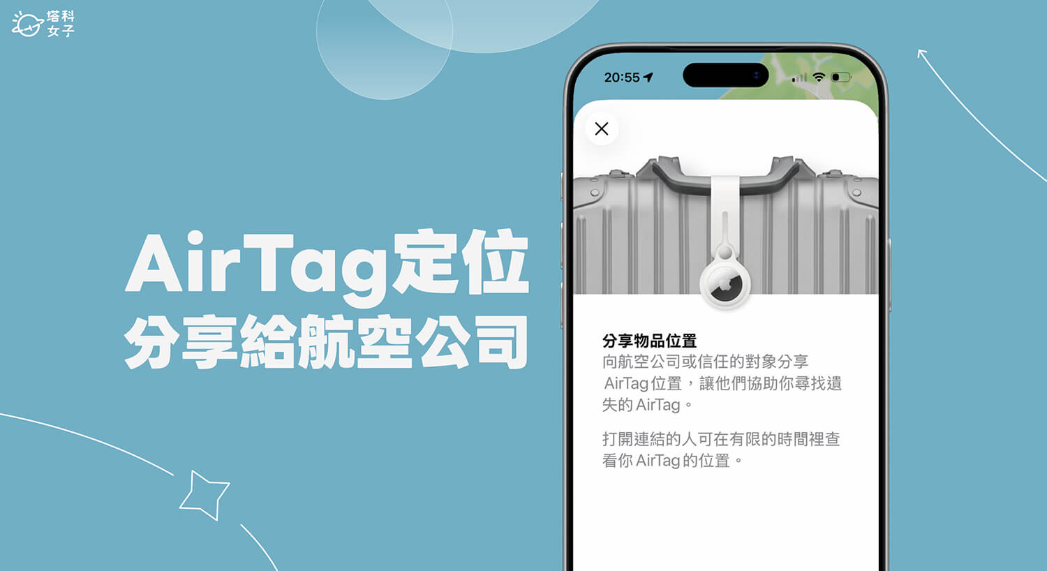 - 而航空公司或其他人員可以在七天內存取你的 AirTag 物品位置,好讓他們幫你找回行李,你隨時也都能點進去停止分享。