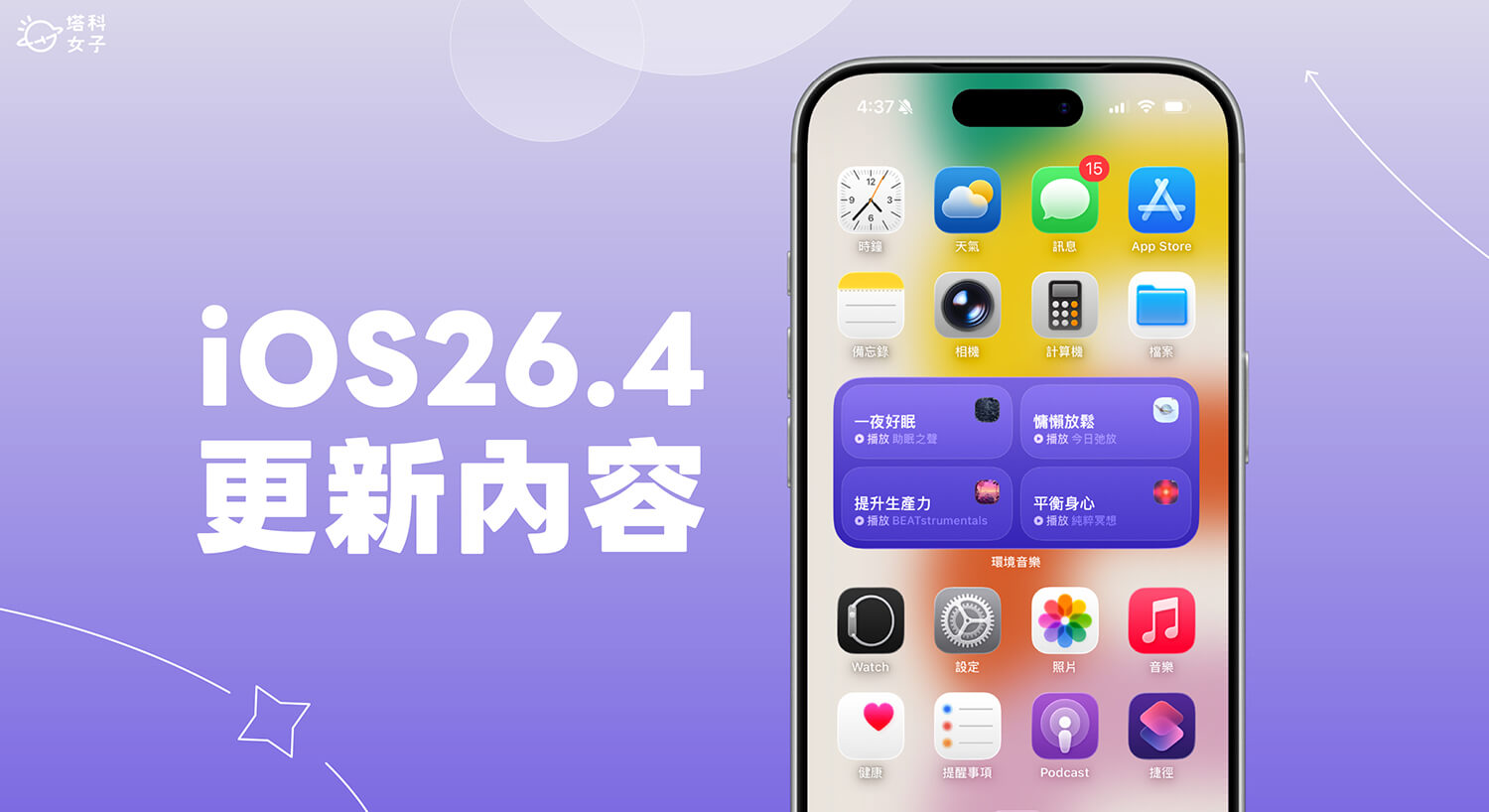 蘋果即將正式推出 iOS 26.4 版本了!這次更新帶來不少蠻實用的新功能,除了新增 8 款全新的表情符號 emoji 之外,還加入了新的「環境音樂」桌面小工具、支援繁體中文的即時字幕,並且也針對 Apple Music、健康 app、提醒事項 app 、Apple Podcast 以及個人熱點帶來一些新功能,最棒的是,也修正了 iPhone 鍵盤的打字問題。那接下來就一起看看 iOS 26.4 正式版到底更新了哪些內容吧!