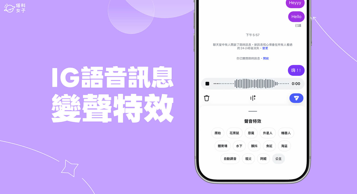 Instagram 最近推出一項有趣又好玩的 IG 語音特效功能,就是可以把你錄的語音訊息變聲成其他聲音,像是:祖父聲、阿嬤聲、外星人、花栗鼠、公主、機器人等等,目前一共有 13 種全新的 AI 變聲特效!